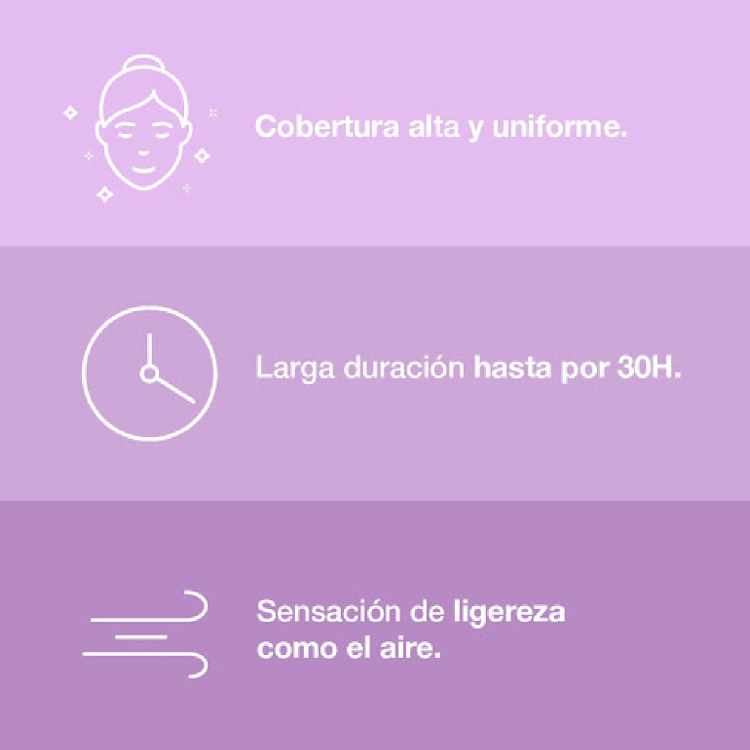 La base Super Stay Lumi-Matte ofrece una cobertura uniforme y una duración de hasta 30 horas. Su fórmula ligera como el aire, enriquecida con aminoácidos, proporciona un acabado mate y luminoso.