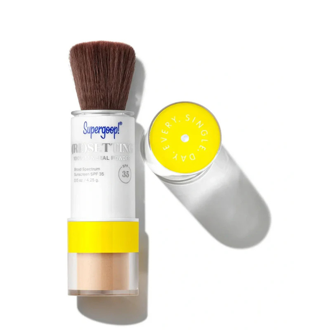 • Protege y perfecciona – Supergoop! El polvo (re)fijador es un polvo mineral que no contiene nano minerales que te permite establecer el maquillaje, matificar el brillo y volver a aplicar tu protección UV (¡incluso sobre maquillaje!) de un solo golpe.